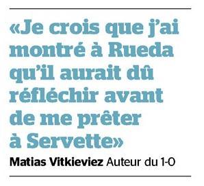 Nous, on devait absolument gagner ce match comme tous les autres pour espérer quelque chose. Et moi j’avais une petite revanche à prendre avec Rueda : je voulais lui montrer qu’il s’était trompé avec moi; d’ailleurs le titre de la Tribune de Genève c’était « Vitkieviez veut montrer à Rueda qu’il s’est trompé ».