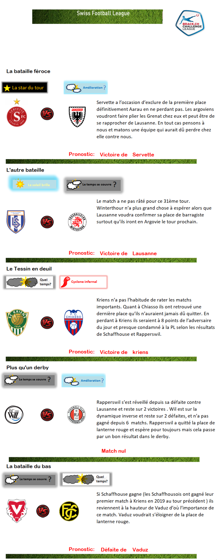 A l’issue de ce tour 31, j’espère vivement que vaduz en fasse les frais. Les places sont chères en sl/cl et à mon avis, toutes les régions de Suisse doivent être représentées. On a déjà assez de bourbines comme ça, on a donc nullement besoin encore de Vaduz. Aux armes.