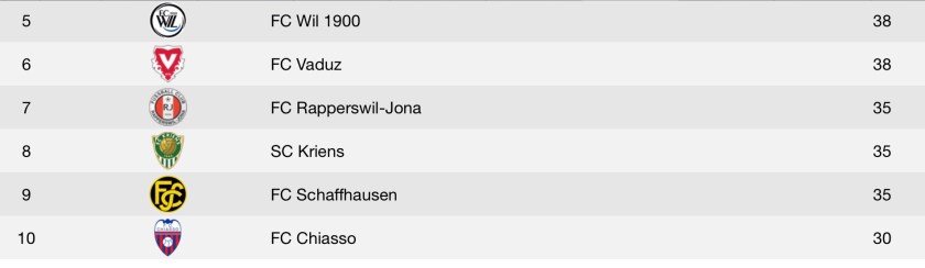 En effet si Chiasso perd, c’est quasiment fini pour eux. En cas de match nul contre un concurrent direct qu’est Rapperswil, ce serait aussi un très mauvais résultat non seulement par rapport à eux mais aussi les 4 autres que sont Schaffhouse, Kriens, Wil et Vaduz (mais ces 2 derniers à un moindre degré).