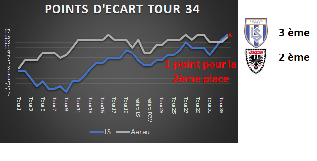 • Les deux dernières rencontres verront les argoviens se déplaçaient dans le champ de patates de Chiasso jeudi soir alors que le LS ira à Kriens. Donc 2 candidats aux barrages chez 2 candidats à la relégation. Ensuite le LS recevra Vaduz qui ne joue rien et Aarau recevra le triste Rapperswil qui pourrait se sentir libre dépendant des résultats du tour 35