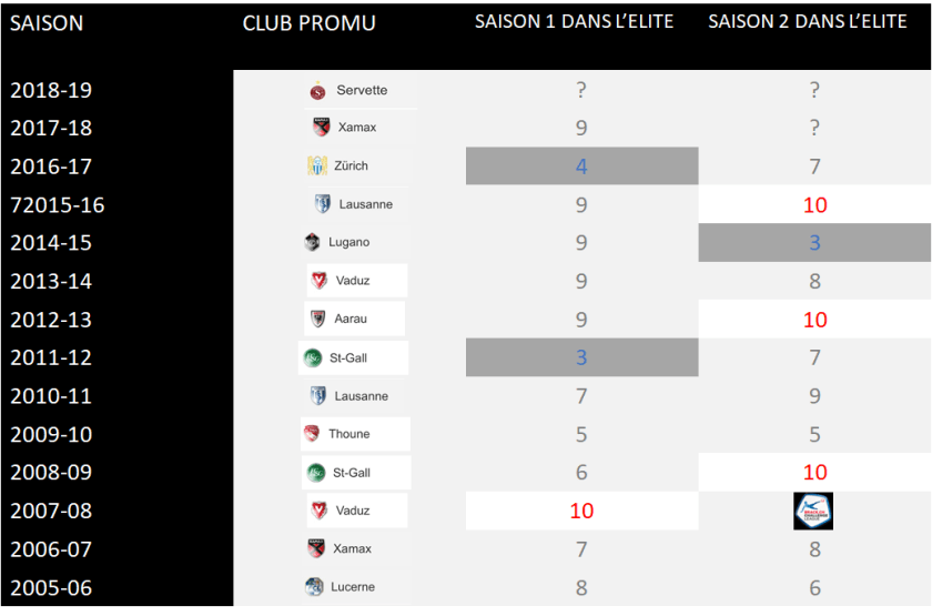 Les promus réussissent plutôt bien la transition Challenge League – Super League et le passé le montre que très très peu d’équipe font l’ascenseur. En fait seul Vaduz en 2008-09 ces dernières saisons a terminé dernier après être monté donc est redescendu aussi vite qu’il a monté.