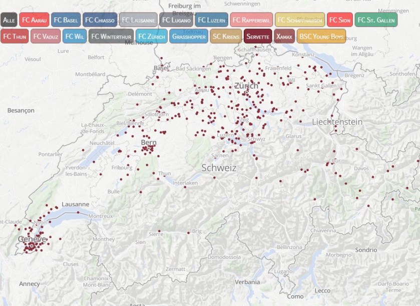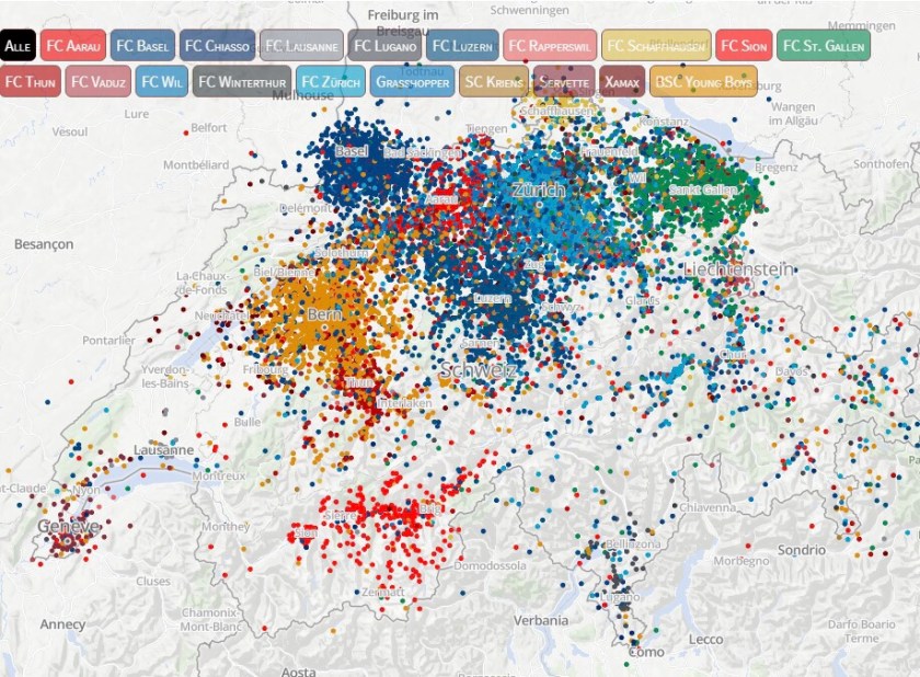 Toujours selon le Blick, on remarque également logiquement pour les autres clubs helvétiques une très forte concentration de supporters dans la zone proche du club, mais proportionnellement peut-être pas forcément aussi nombreux hors canton.