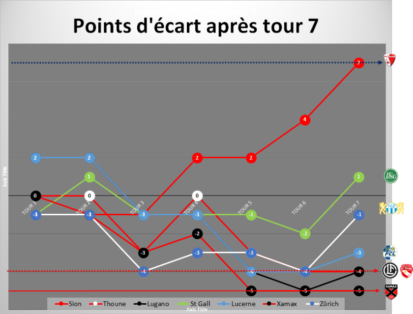 - Le tour 7 a vu Servette perdre à St Gall qui passe devant mais dans le même temps Xamax a aussi perdu à domicile contre Sion donc on garde la même écart avec le dernier soit 5 points
