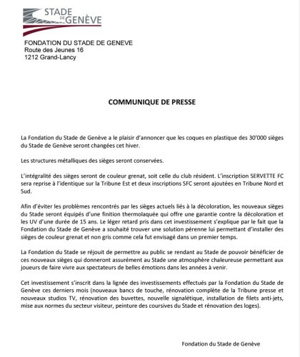 du Stade de Genève seront changées cet hiver. L’intégralité des sièges seront de couleur grenat, soit celle du club résident. L’inscription SERVETTE FC sera reprise à l’identique sur la Tribune Est et deux inscriptions SFC seront ajoutées en Tribune Nord et
