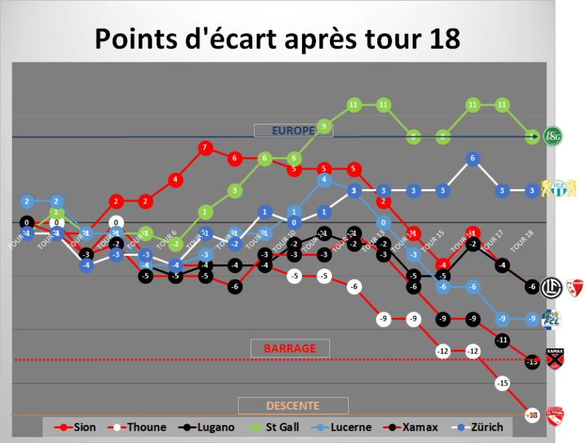 • Les candidats à la CL ont été distancés puisque Thoune est à 18 points et Xamax le barragiste est à 13 points