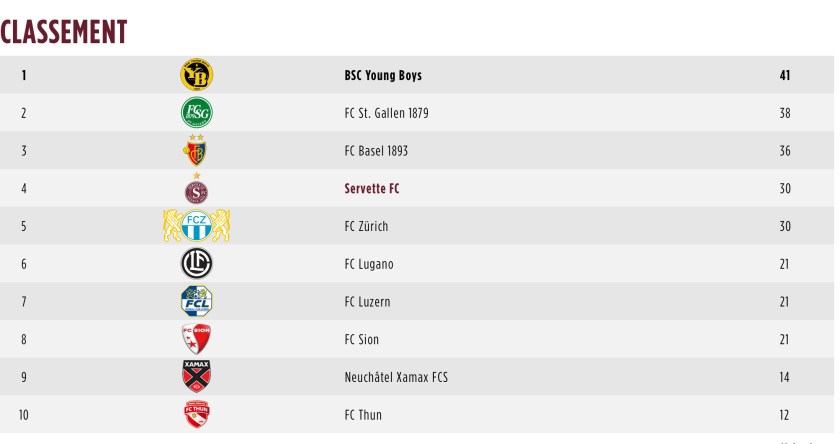 • Le premier poursuivant pour nous est le FC lZürich qui a le même nombre de points mais une différence de buts nettement défavorable de – 10 (versus +11 pour les Grenat) et ira au prochain tour à Sion (FC Sion – FC Zürich)