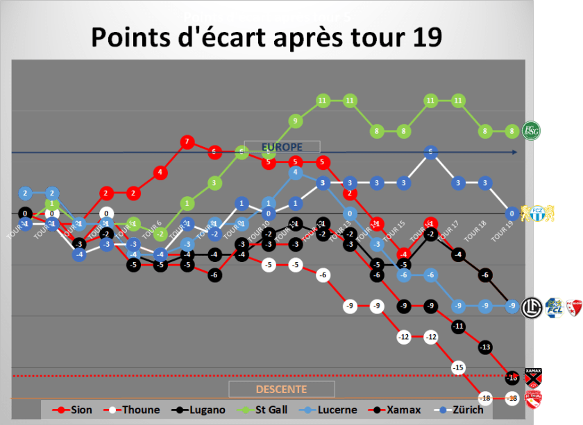 • Si on regarde vers le haut, juste au dessus se trouve le FC Bâle à 6 points (ils ne sont pas sur le graphique) et le FC Saint Gall (deuxième!) à 8 points qui ira d’ailleurs au tour prochain chez les rhénans