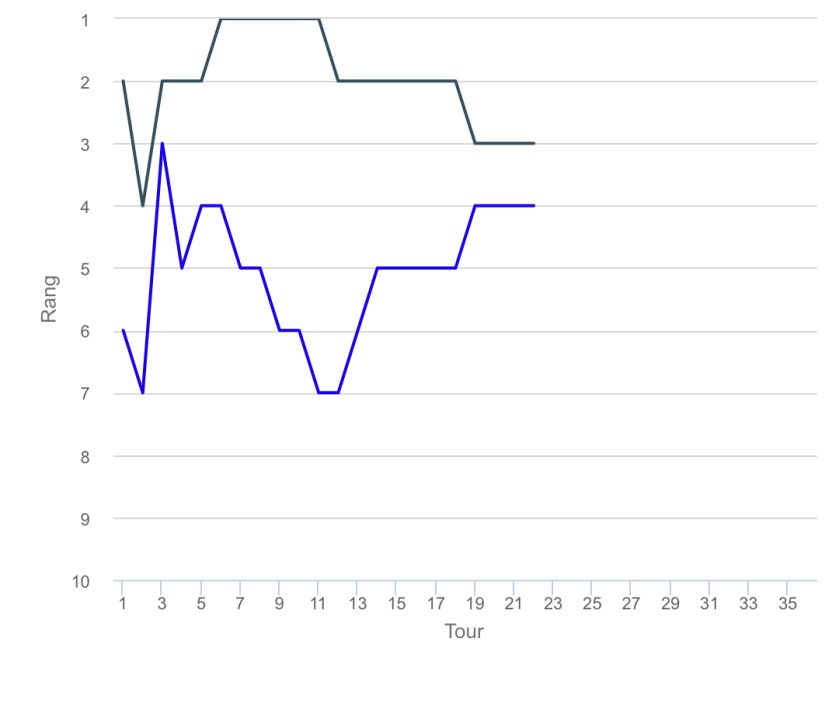 Évolution des 2 clubs (Servette en bleu et Bâle en noir) après 22 tours