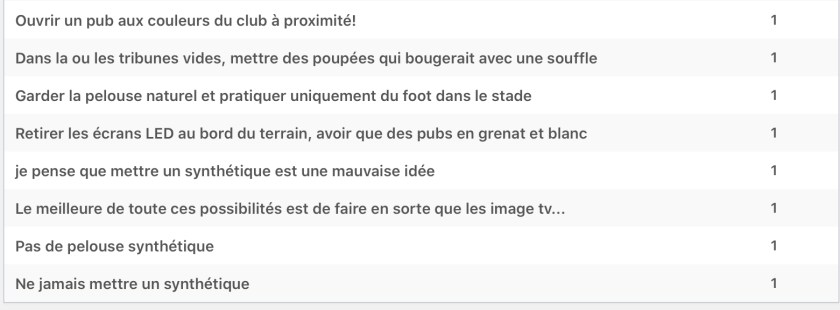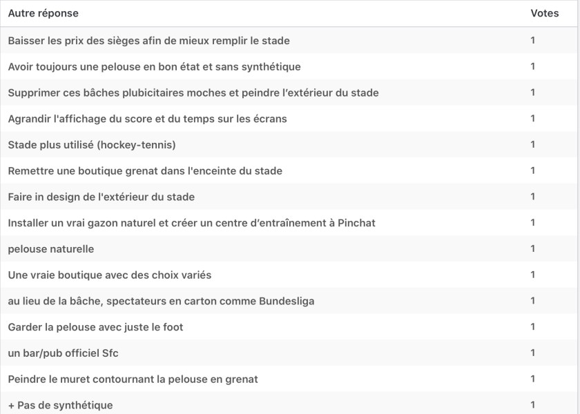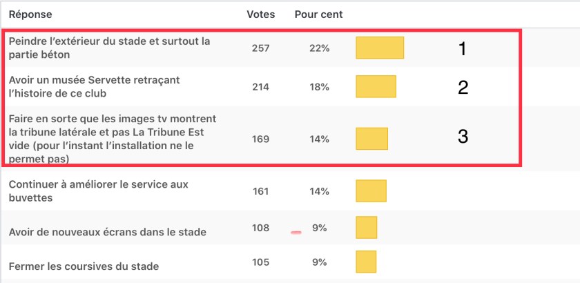 Résultats du sondage sur les améliorations à faire encore pour le stade
