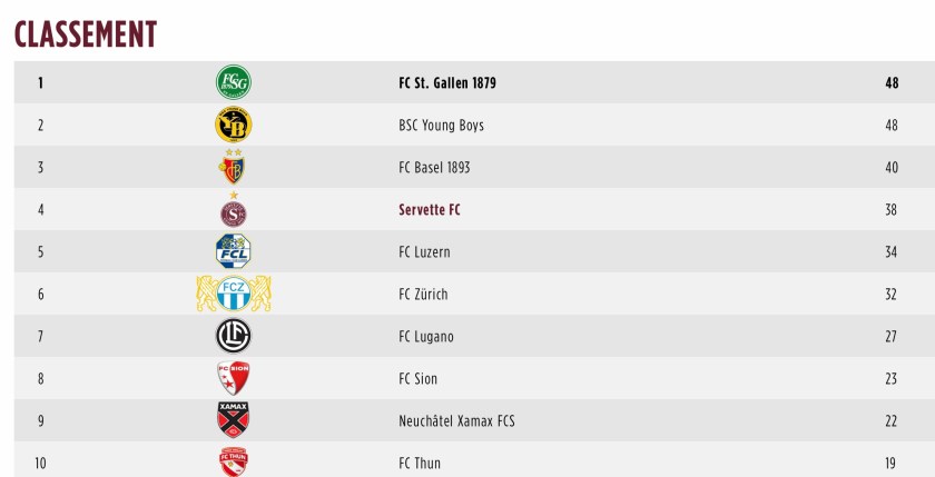 • Servette sent le souffle dans son dos de FC Lucerne qui est à 4 points et est passé à la quatrième place  devant le FC  Zürich mais FC Bâle sent le souffle du Servette FC