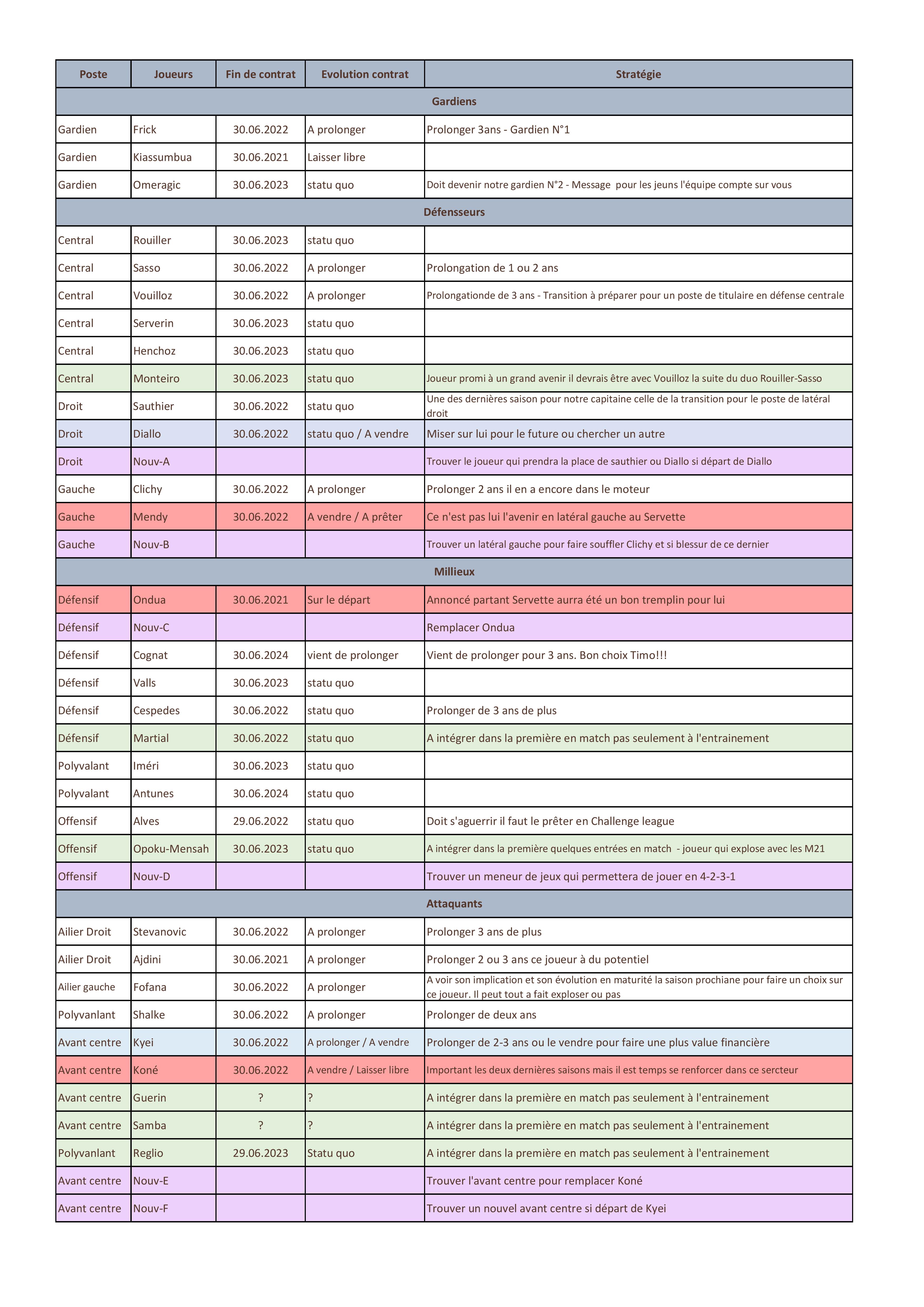 Perso, je dis un bon renfort pour chaque ligne, peu de changements et une certaine stabilité. Quelques prolongations sont d’ores et déjà fondamentales et puissent les dirigeants Grenat s’inspirer de ton analyse.