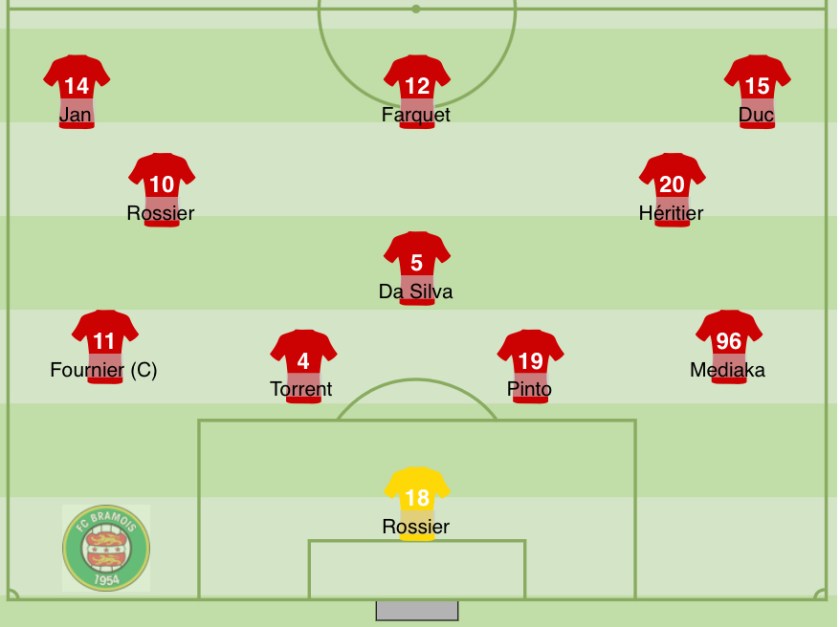 Le 4-3-3 habituel du FC Bramois. Combien de buts prendra Rossier contre Servette?