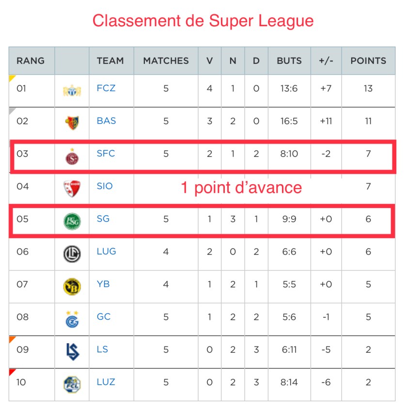 1 petit point d’avance sur l’adversaire du jour le FC Saint Gall pour les Grenat. Alors que dans le même temps, le FC Sion ira à Lausanne pour jouer un derby électrique car les deux équipes doivent gagner. Derrière nous, les 6, 7 et 8 ème au classement peuvent nous passer devant si nous ne gagnons pas (en gagnant bien sûr). Notamment YB qui reçoit le FC Lugano et ne peut se contenter d’une septième place.