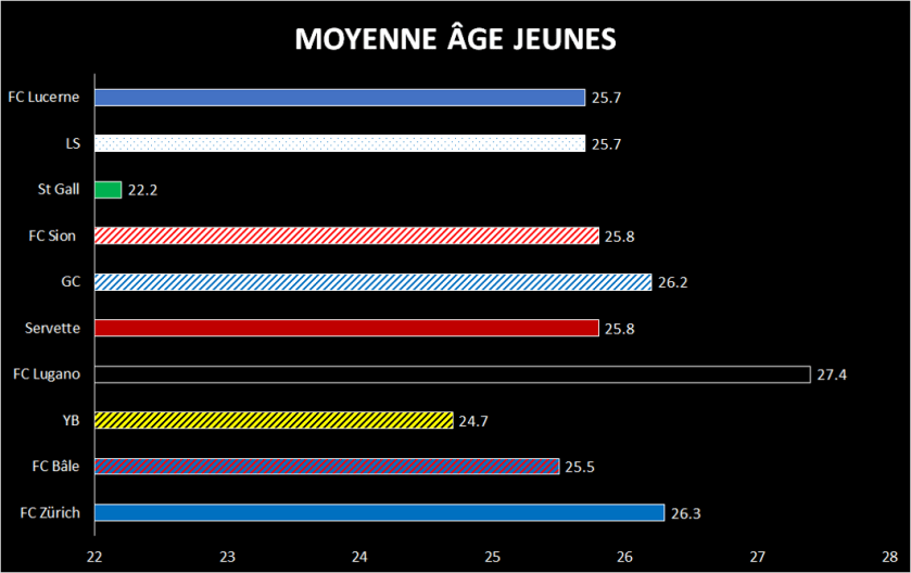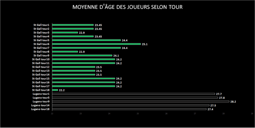 L’autre record est celui de l’équipe qui a le plus de joueurs âgés sur le terrain, c’est l’équipe tessinoise du FC Lugano avec une moyenne d’âge de 27.4 pour le dernier tour mais une tendance identique sur cette première partie de saison. On voit clairement la différence avec Saint Gall mais nous ne sommes pas surpris car la série A italienne a très souvent utilisée le club tessinois.
