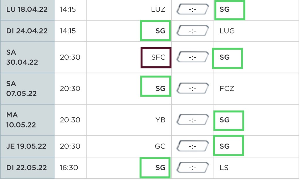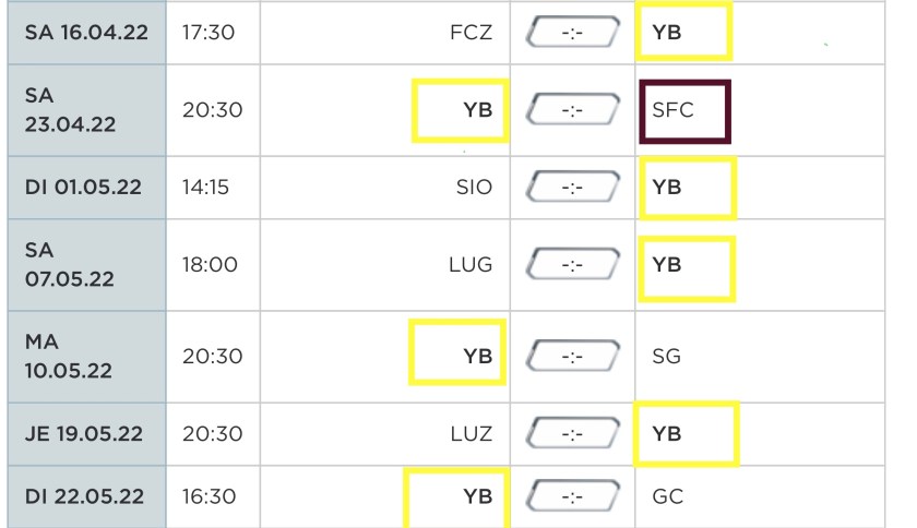 Avec encore 4 matchs et un match à Sion, nous avons un léger avantage alors que YB et Saint Gall ne joueront que 3 fois à la maison.