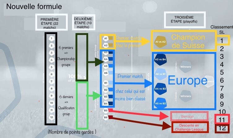 - Aucun changement de la formule actuelle, du déroulement en Super League et Challenge League mais des changements au niveau des relégations et promotions