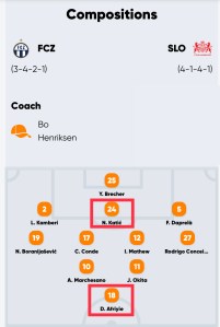 A la surprise générale, Rouiller était en charnière centrale et a d’ailleurs très bien joué (mais 120 minutes après tout le match contre Lucerne). Severin n’ayant joué que 5 minutes contre le SLO, il devrait retrouver sa place dans le 11. Sur les côtés c’est plus problématique car Mazikou et Tsunemoto ont joué 120 minutes après les 90 minutes dimanche.