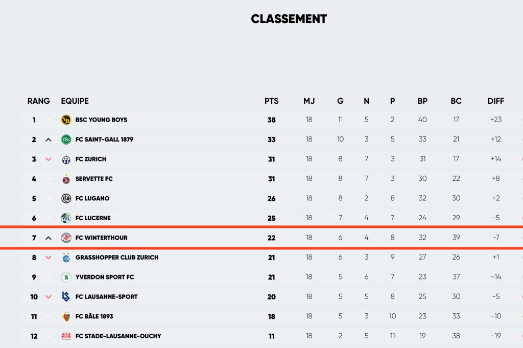 Comme la saison dernière, le club zurichois nous refait son parcours de reléguable qui enchaîne ensuite les victoires. Après 4 défaites d’affilée, ils ont accumulé 2 victoires de suite (contre le FC Zurich et le LS). En trônant à la 7 ème position du classement, le “petit” club zurichois est devant, entres autres, GC et Bâle. Avec déjà 22 points au classement général et 11 points d’avance sur le dernier le SLO, la relégation directe semble lointaine. Mais attention pas la position de barragiste et la 11 ème place du FC Bâle qui est à 4 points seulement. Le danger reste donc là pour Winterthour.