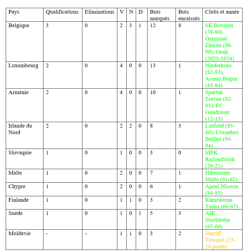 Excellente parcourir cette liste me rappelle pleins de souvenirs. Merci pour cette belle synthèse et espérons que l’on puisse bientôt rajouter une petite ligne verte dans la case de la république Tchèque. Allez Servette!!!