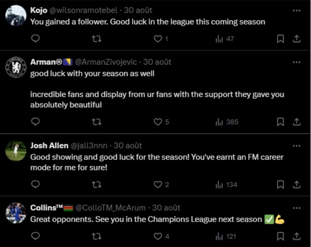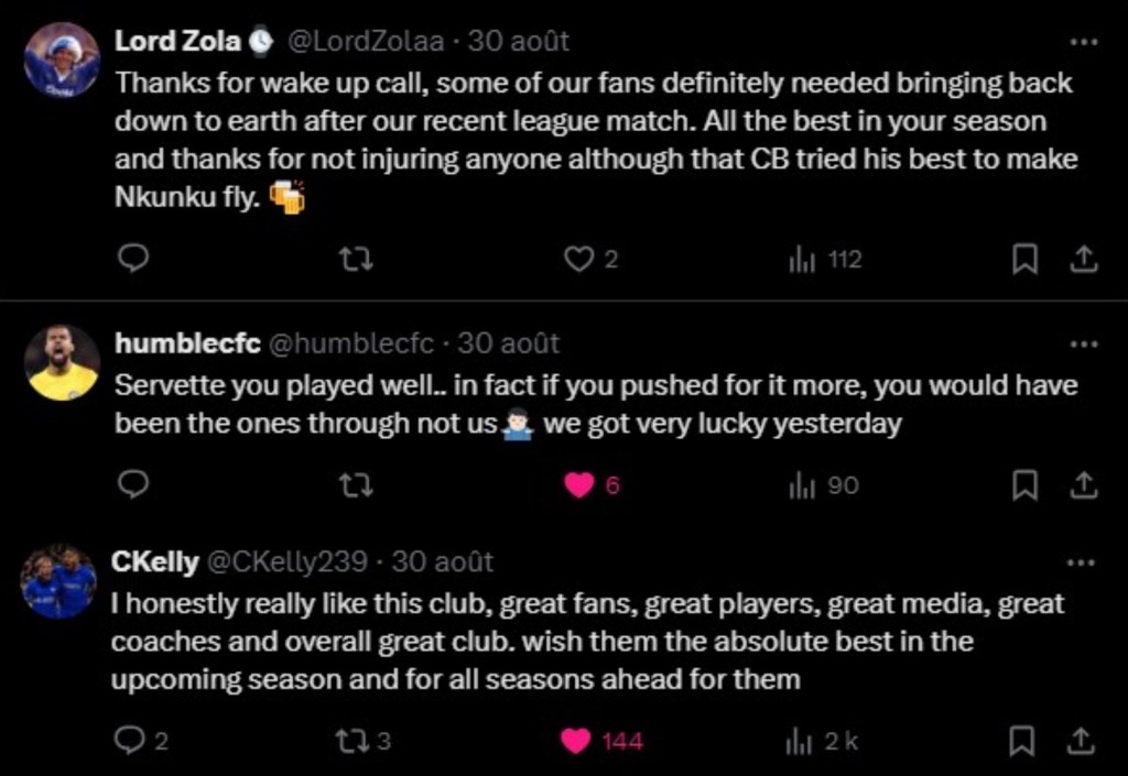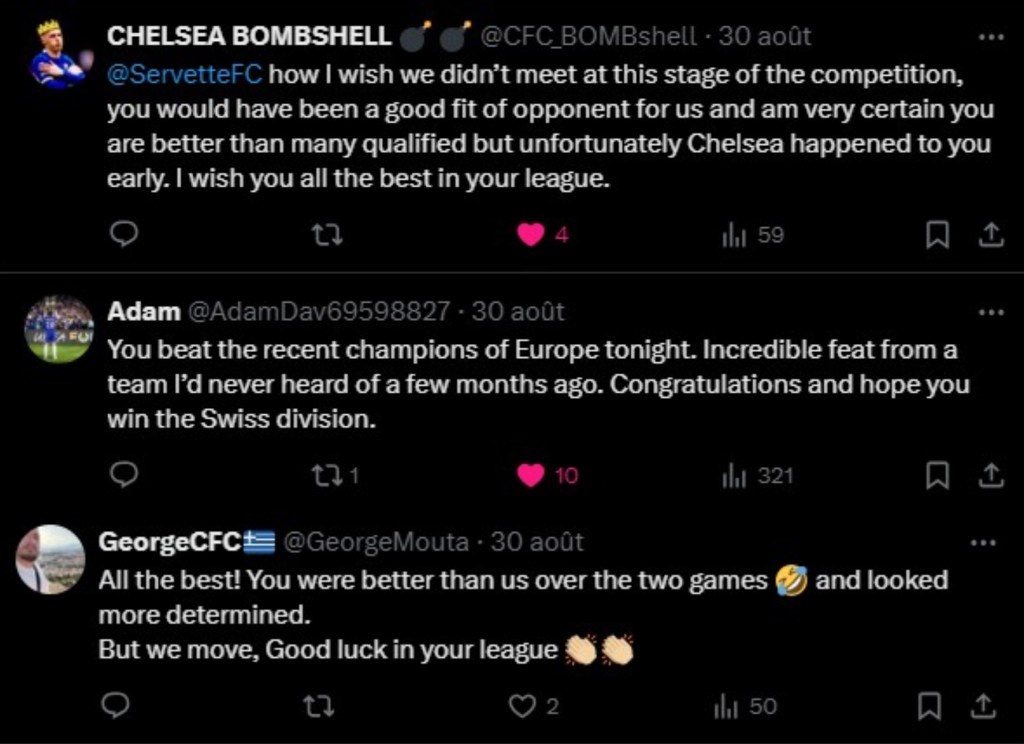 En effet, cette confrontation contre Chelsea aura un impact énorme. Au niveau national , mais aussi au niveau mondial. Jamais Servette s’est retrouvé autant médiatisé que lors de ce match retour. Il faut savoir que les clubs anglais de Premier League ont des supporters dans le monde entier et spécialement les têtes d’affiche dont fait partie Chelsea. Et si beaucoup de ces supporters nous ont sous-estimé voir, se sont parfois moqué de nous avant de jouer, ce qu’il en ressort sur les réseaux après ce match retour est tout autre. On remarque plutôt beaucoup du respect, et nombreux sont ceux qui ont été surpris par le niveau des Grenat. Des personnes en Asie, en Afrique et en Europe ont largement réagi à notre victoire. Petit florilège de ces réactions: