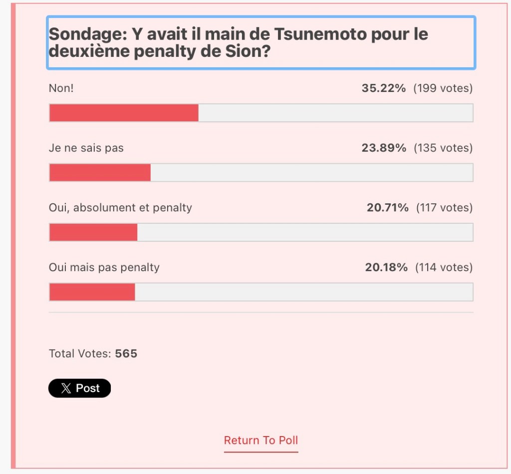 19 réflexions sur « Sondage: Y avait il main de Tsunemoto pour le deuxième penalty de Sion? »