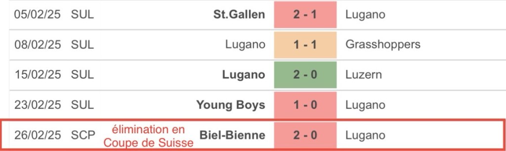 Résultats du FC Lugano. En rouge les défaites et en vert les victoires