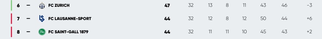 Saint Gall est peut être le mieux loti pour la rencontre mais n’a l’avantage que sur le FCZ pour la différence de buts. Une victoire cependant combinée à une défaite FCZ et une non victoire du LS les propulseraient dans le fameux wagon.