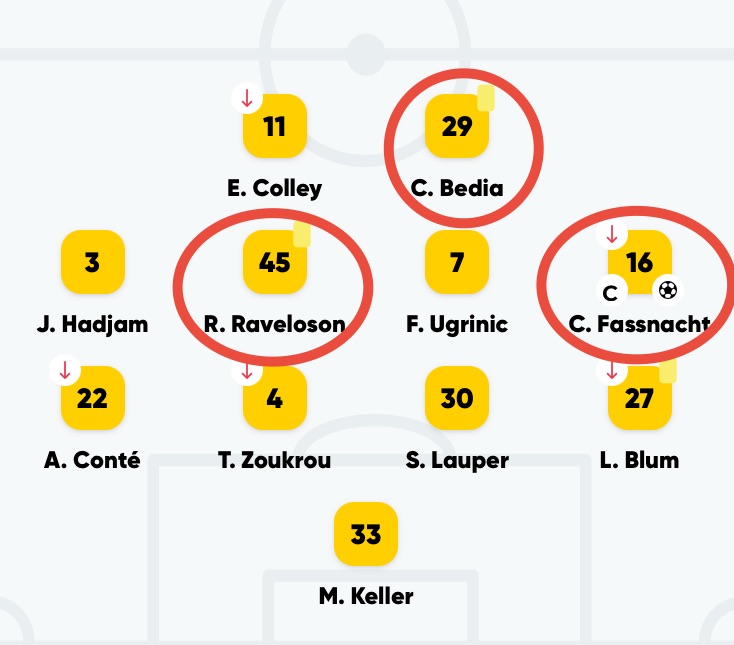 Photo SFL – Copyright. La composition d‘YB contre le LS et, en cercle rouge, les joueurs arrivés en janvier