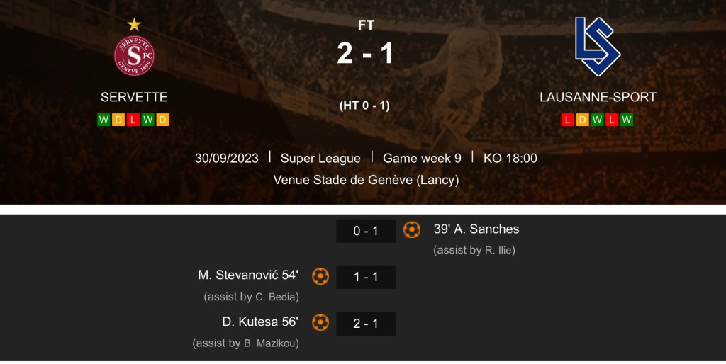Quant est il des dernières visite du LS dans la capital lémanique?Comme on est très modeste à Genève, on ne parlera que très peu des victoires systématiques des Grenat à La Praille sur le LS depuis 2021, mais sur quelques événements marquants. On pensera à cette soirée exceptionnelle de la montée en Super League où Servette avait terrasser Lausanne 3-1 (mai 2019). On pensera à la victoire 2-1 en septembre 2023 après la provocation de Sanches et son but.