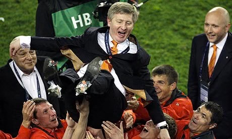 Photo The Guardian – copyright. Le milliardaire ukrainien Akhmetov (ici porté par ses joueurs après sa victoire en 2009 de la coupe UEFA) soutient financièrement son pays en guerre en reversant des pourcentages conséquents de ces transferts