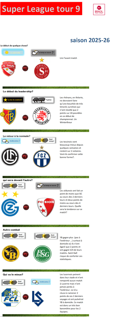 Le temps sur la Super League- tour 9 Par Oscar Obradovic Évaluez ceci :Partager : Partager sur Facebook(ouvre dans une nouvelle fenêtre) Facebook Partager sur X(ouvre dans une nouvelle fenêtre) X Envoyer un lien par e-mail à un ami(ouvre dans une nouvelle fenêtre) E-mail Partager sur WhatsApp(ouvre dans une nouvelle fenêtre) WhatsApp J’aime chargement… Similaire