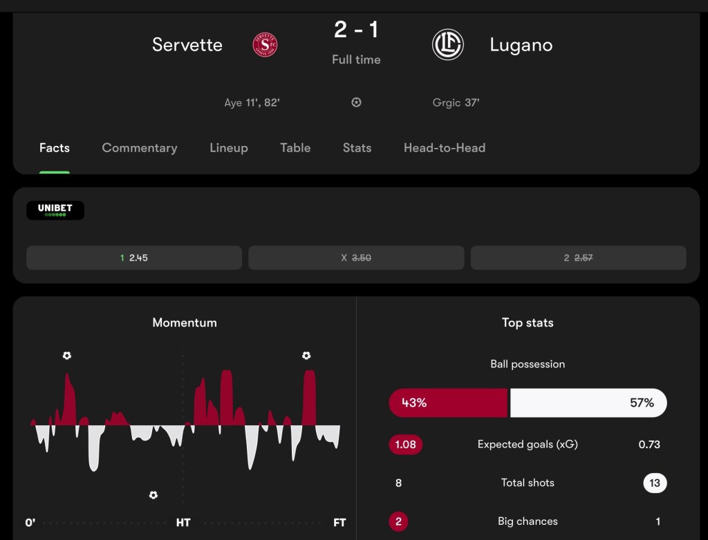 Lugano a eu la possession du ballon, mais une valeur de xG inférieure (0.73 versus 1.08 pour nous). Certes, ils ont été meilleurs au milieu de terrain et dans les duels mais moins dangereux globalement. Donc notre victoire n’est pas si imméritée mais cette fois-ci nous avons été efficaces.