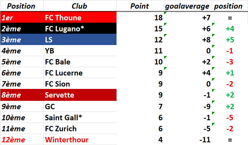 On s’aperçoit que Thoune maintient un rythme de leader alors que le FC Lugano peut faire aussi bien en gagnant 1-0 son match en retard contre Saint Gall et même faire mieux en gagnant par 2 buts d’écart. son rythme est nettement meilleur maintenant. Le LS est très forme et une des meilleures équipes du championnat.