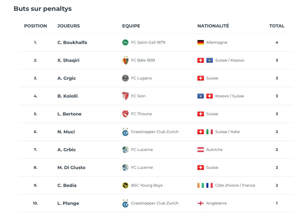 Shaqiri est le plus mauvais tireur de penalty et en a déjà raté 3 cette saison. Il en a manqué 3 donc rate 1 sur 2. Le meilleur tireur de penalty est le saint gallois Boukhalfa, puisqu’il n’est pas seulement en tête du nombre de buts réalisés par penalty mais il a converti 100% de ses penaltys. Boukhalfa est un allemand de 26 ans formé à Freiburg et qui est arrivé cet été en Suisse.