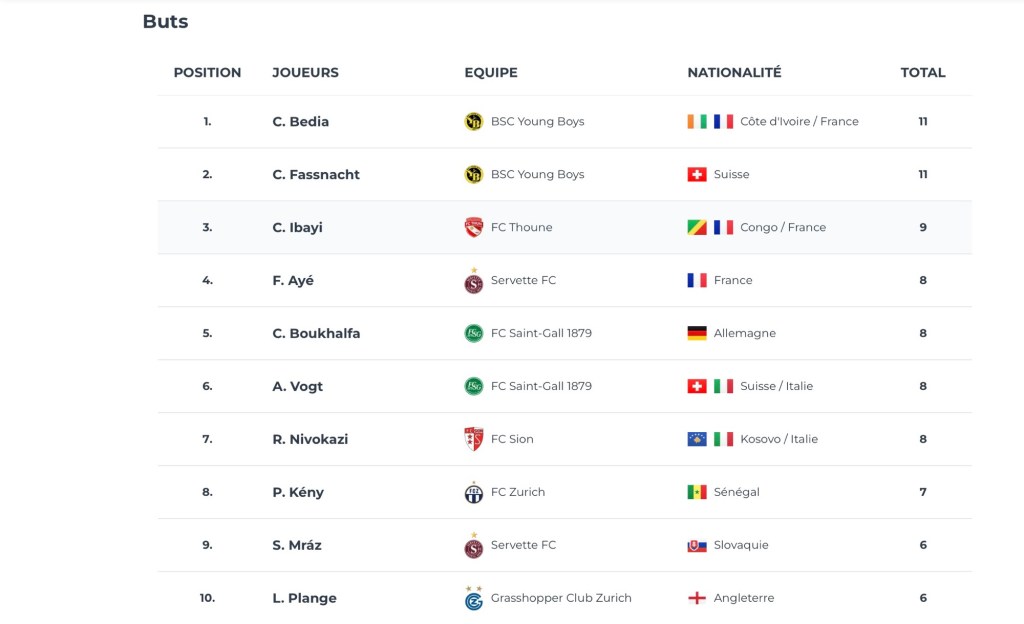 Le meilleur buteur devient uniquement Fassnacht et Aye reste quatrième. Autre changement, Boukhalfa sort du top 10 et Jensen devient le meilleur buteur de GC. Mraz devient sixième meilleur buteur de Super League.
