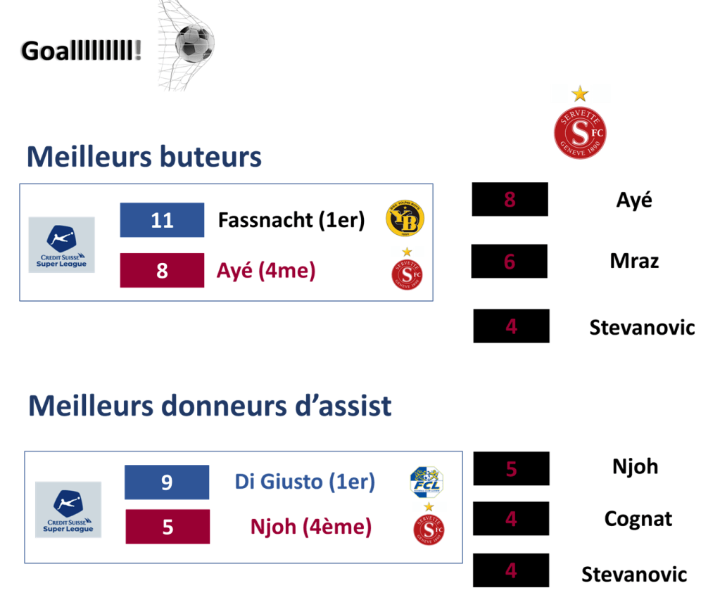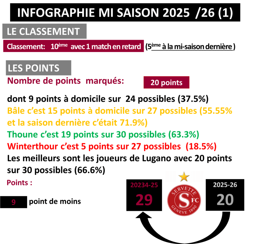 2. Ces statistiques indiquent que Servette ne se trouve pas là où il est par hasard ou par malchance ou à cause de l’arbitrage certes discutables. Point positif : l’intronisation de Grégoire Pictet à la tête de la fondation. Les résultats devraient suivre. Banco !!!!