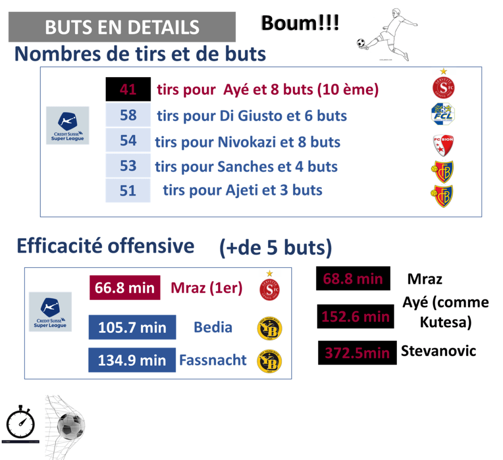 Au niveau des attaquants, on peut se demander pourquoi Ayé, comme Guillemenot, bénéficient tous les deux d’autant de temps de jeu, alors que Mraz, bien plus efficace, chauffe le banc. C’est vrai que Mraz participe moins à la construction du jeu que Ayé (qui ne semble pas toujours savoir quoi faire sur le terrain), mais les joueurs ont des profils différents. Personnellement, j’aimerais voir Mraz plus souvent et Guillemenot un peu moins, même si ce dernier à mis quelques buts dernièrement (bilan global catastrophique/largement insuffisant de notre no 21 depuis son retour à Servette).